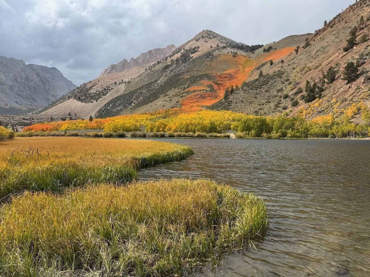 North Lake, middle fork of Bishop Creek and Weir pond all have great fall colors and should peak by the weekend or early next week. Fly fishing in Bishop Creek has been a blast for stocked rainbows, wild brown and wild brook trout. Fishing a size 16 stimulator and a size 16 tiger midge in the pockets and pools of the creek has been the effective method of fooling the trout. Best dry fly to fish with is your favorite dry fly as you will fish it with the most confidence. High visible and high floating flies like stimulators, Adams parachutes, elk hair caddis and Royal Wulff’s are great dry flies for Bishop Creek. For the nymphs fish with size 16 bead head flash back gold ribbed Hare’s ears, size 18 bead head flash back pheasant tail nymphs, size 16 Prince nymphs, size 16 green/gold brassies and size 16 midges in zebra and tiger coloration. The fun part of fishing the creek is walking along the brush lined banks looking for that pool or pocket to drift your flies through. Then watching the dry fly move and setting the hook on a nymph eating trout or watching a trout rise to the surface to take your dry fly. Bush whacking the creeks that drain the Eastern side of the Sierra is one of my favorite ways to fly fish.