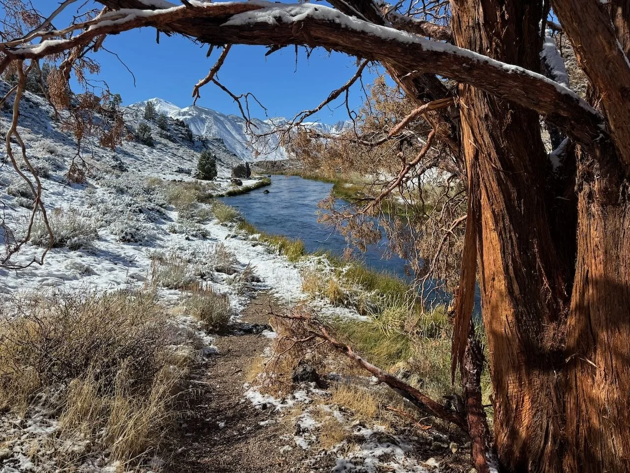 The first winter storm of the year passed through the Eastern Sierra this week leaving snow at upper elevations and rain in the Owens Valley. For now I put away the shorts, flip flops, wet wading boots and the wet wading pants. I’ve replace them with jeans, tennis shoes, waders and wading boots. It looks like we will be back to normal temperatures in the Eastern Sierra by the start of next week. These storms have a bigger effect on the fly fisher than the trout. It may take a day or two for the streams to clear all the extra water running into them. This should be a great opportunity for fall color photos of your favorite water with fresh snow on the mountain tops. The trout are feeding on mayflies, caddis flies and midges on the surface and on the substrate. If you’re into throwing those meat pattern streamers now is the time to use them looking for a big trophy trout.