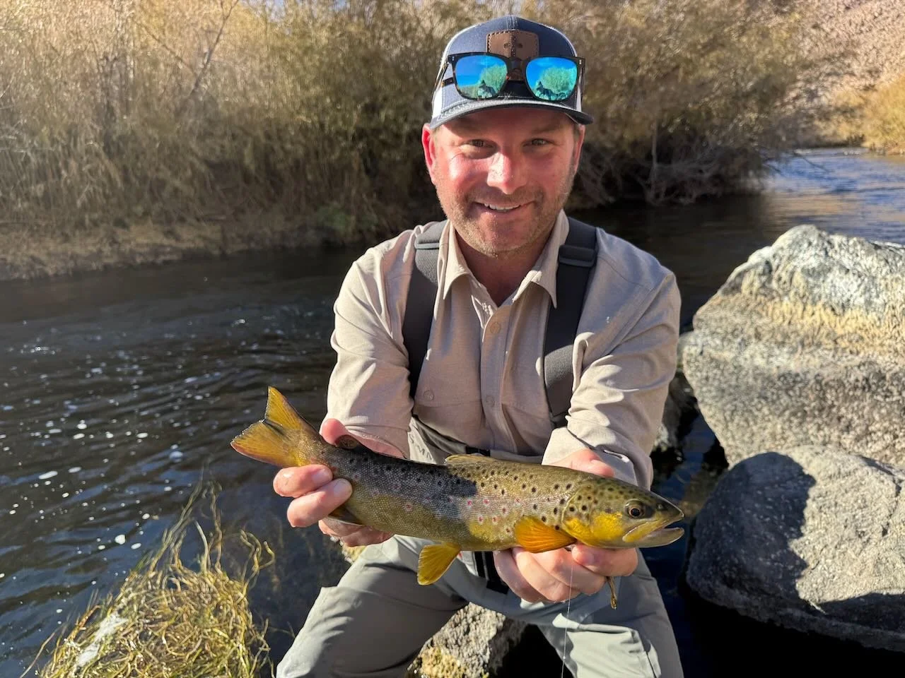 Kevin Botsford from Pasadena showing off a brown trout that took a size 18 bead head flash back pheasant tail nymph fished under an indicator.