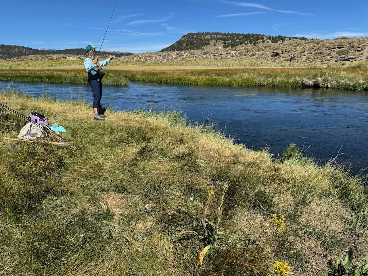 Checking the fly for vegetation is a constant battle on Hot Creek in late summer.