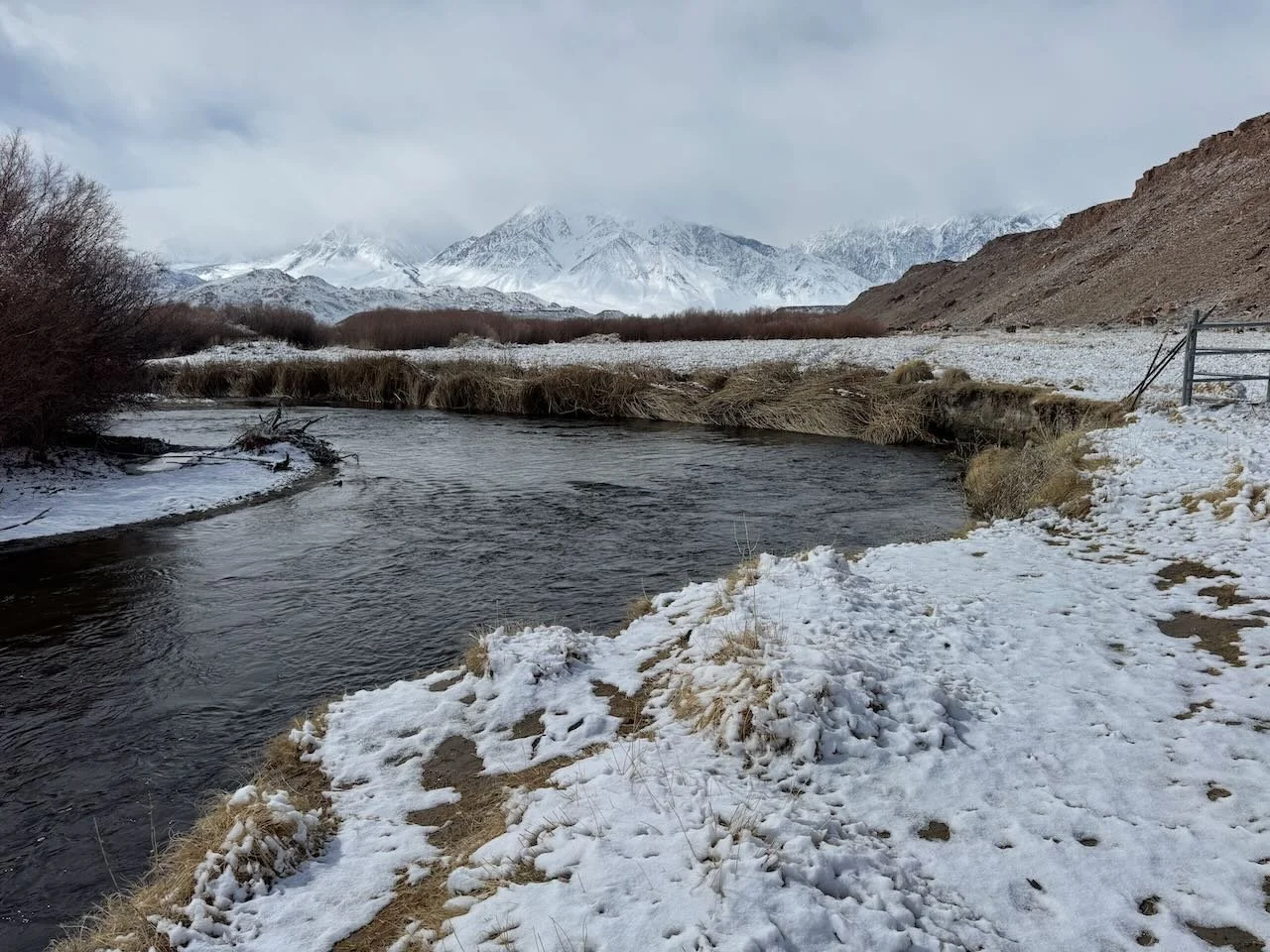 The Owens Valley got snow and the lower Owens River is dressed in a blanket of snow.
