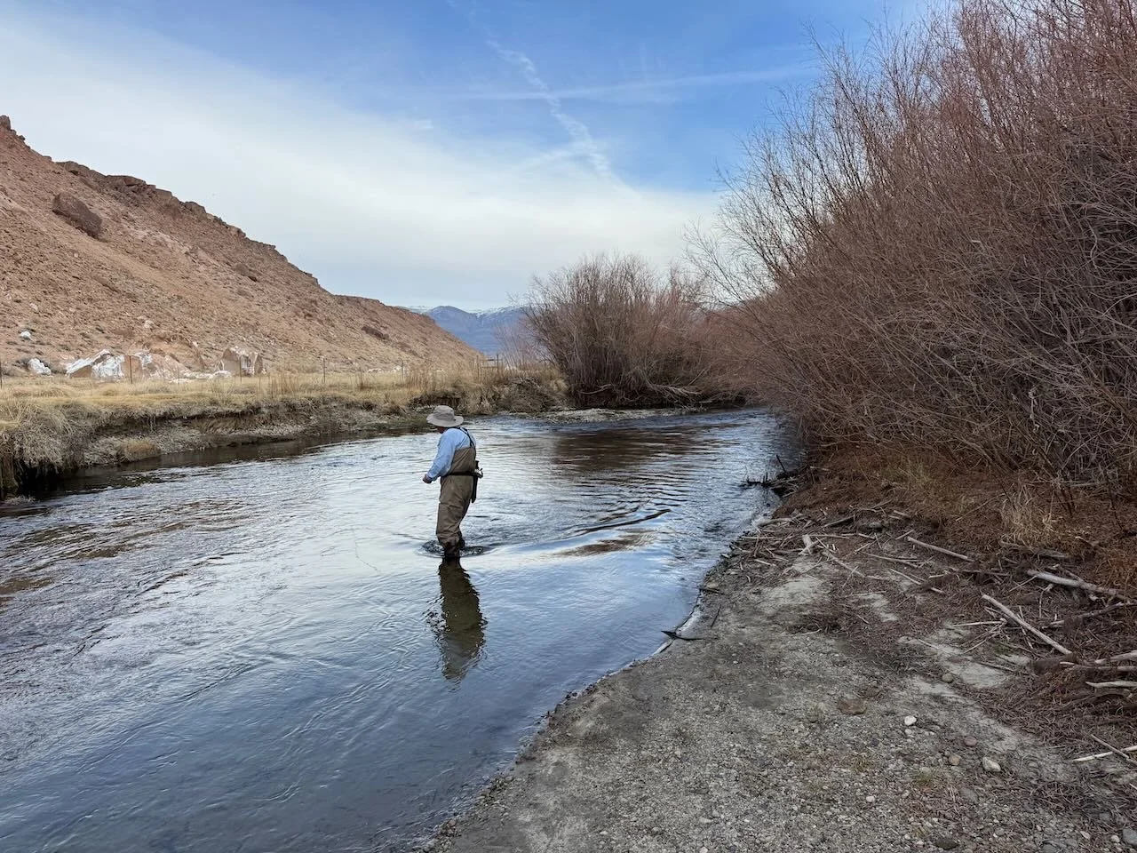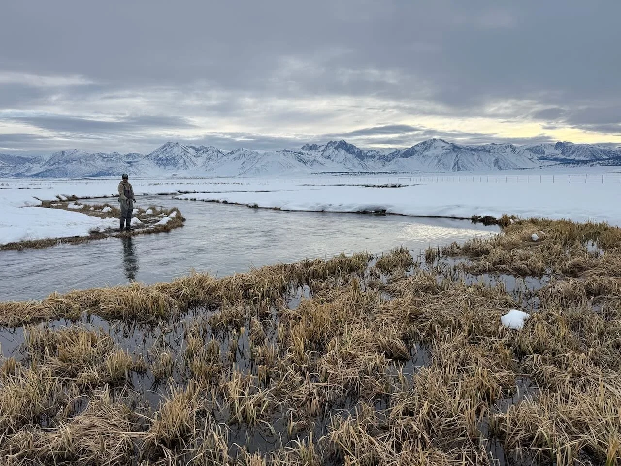 Upper Owens River offers good fly fishing for trophy rainbow trout for fly fishers willing to work the banks and walk through the snow on the banks of the upper Owens River.