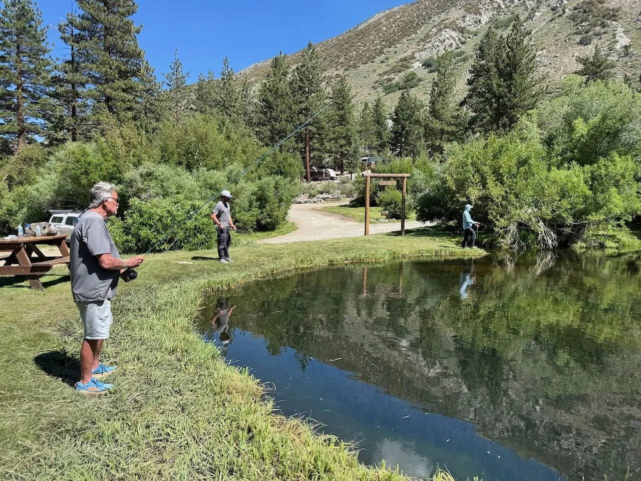 Afternoon winds and hot temperatures is making it hard to fly fish the upper Owens River in the afternoons. Fly fishers need to be on the river early to take advantage of the trout feeding on nymphs in the pockets and deep holes. Nymphing with an indicator or Euro rod with size 16 bead head flash back gold ribbed hare’s ears, size 18 bead head flash back pheasant tail nymphs, size 18 olive quildigons and size 12 stoner nymphs are producing eight to 18 inch wild rainbows and browns. Mid-afternoon winds makes dry fly fishing tough. With few to no grasshoppers around fishing with size 16 elk hair caddis, size 18 Adams parachutes and size 16 stimulators is brining a few six to 12 inch trout to the surface. Throwing olive slumpbusters in size 10, olive wooly buggers in size 10 and size 10 Hornberg’s is producing a few fish in the morning for those fly fishers pulling streamers.