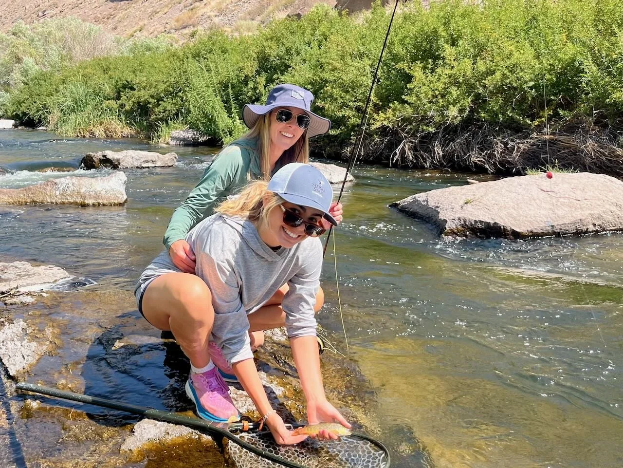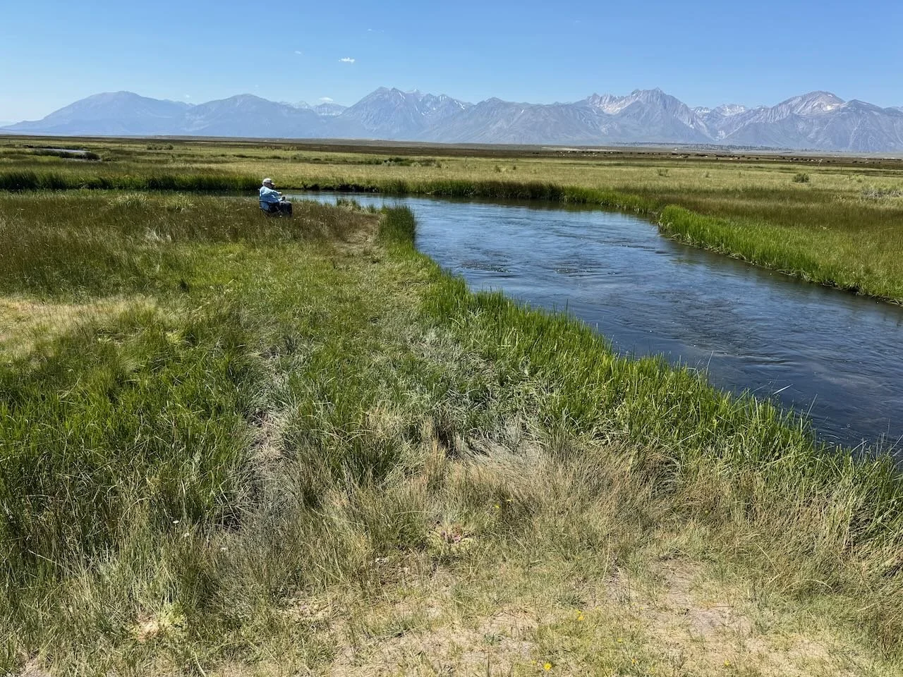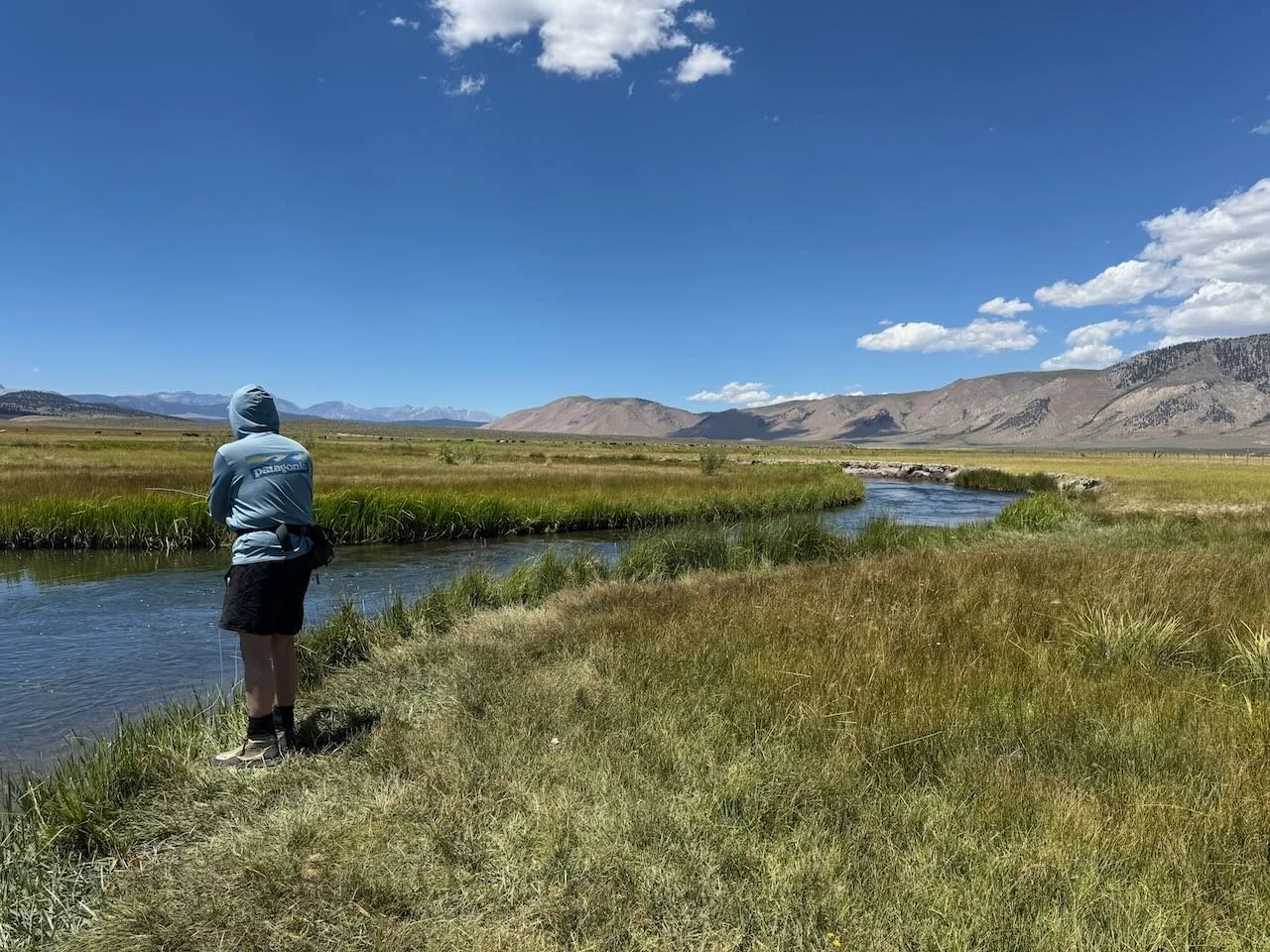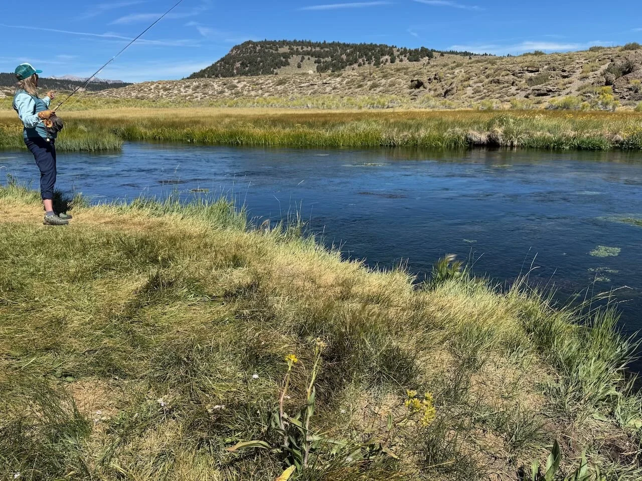 Julie Faber from Bishop enjoying the morning trico hatch on the Interpretive site of Hot Creek fishing with a trico spinner pattern.
