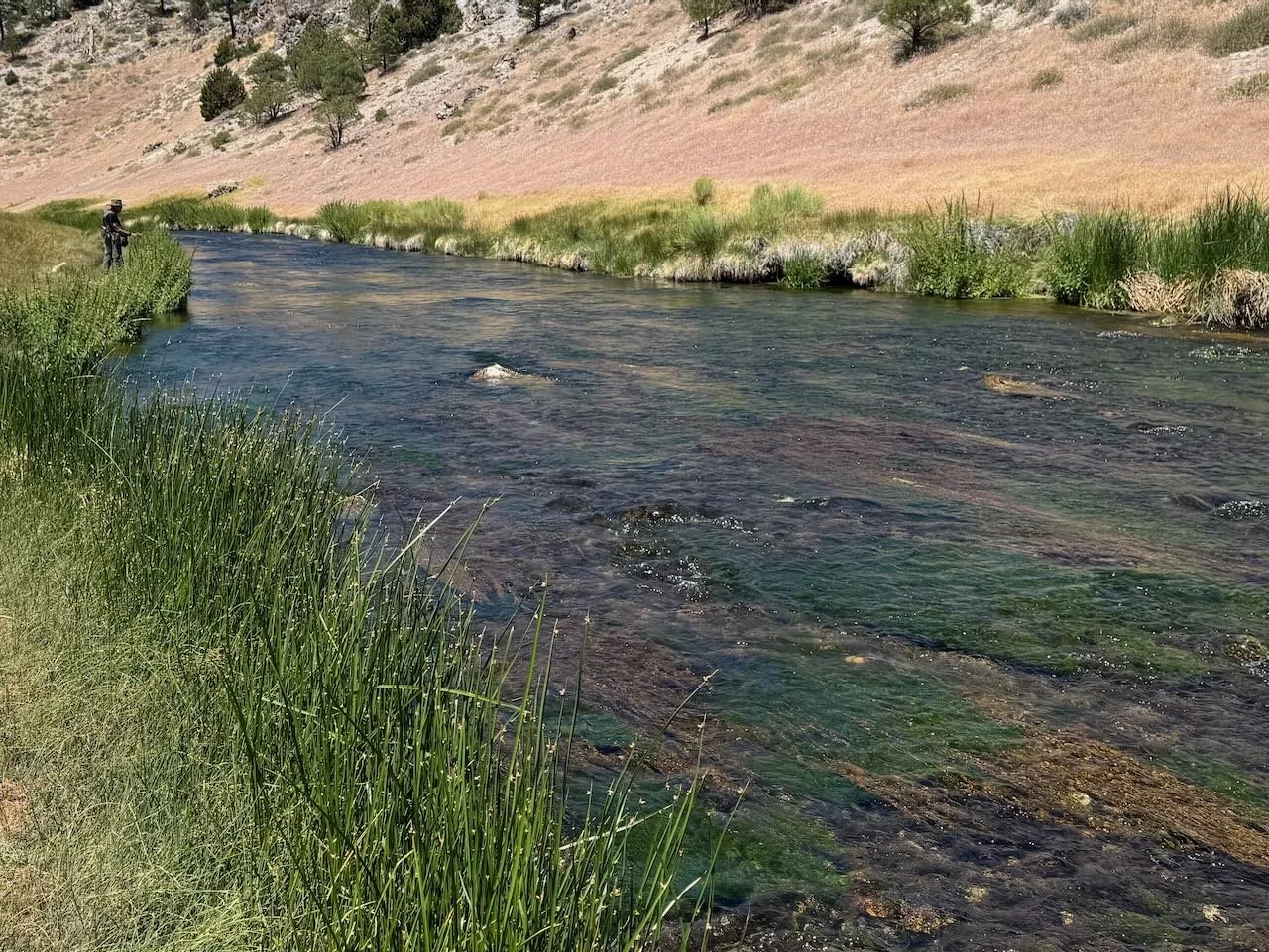 It’s interesting to observe the changes in fly fishing behavior of Hot Creek over the years. It the 1980’s and 1990’s few fly fishers fished the Interpretive Site of Hot Creek because it was too hard to get the fish to take dry flies. Now adays it’s the Hot Creek Canyon that fly fishers are avoiding because it’s too hard to fly fish in between the weed beds. Hot Creek is a technical spring creek that is rated as the easiest to fly fish hard water in the Eastern Sierra. This area requires pinpoint accurate casts to get short drifts in the tiny lanes between the weed beds. Drifting the dry fly that represents the stage of the insect the trout are feeding on is what will produce trout in the canyon. Start the morning early in the canyon with a size 22 female trico parachute and size 22 sparkle duns. Once the trout quit taking your female trico parachute switch to a size 22 trico spinner pattern. Once the hatch is over try nymphing the deeper holes, pockets and waters without weeds with size 22 olive quilldigons, size 20 pheasant tail nymphs, size 22 tiger and zebra midges. Hot Creek Canyon has a few hoppers flying around and fly fishing a hopper pattern in the afternoon wind will produce a few trout.