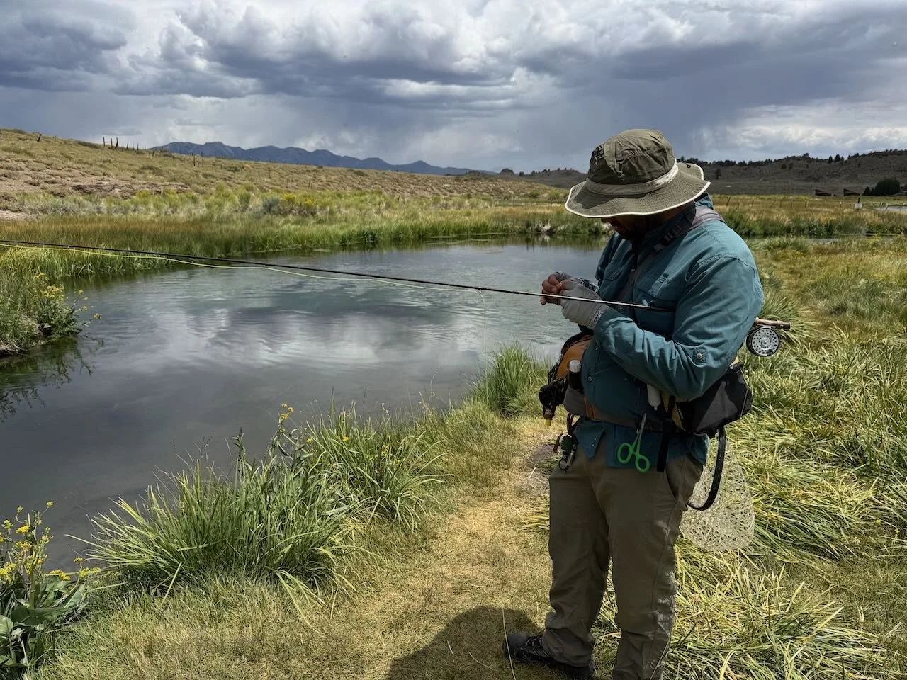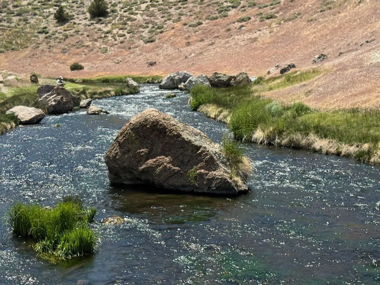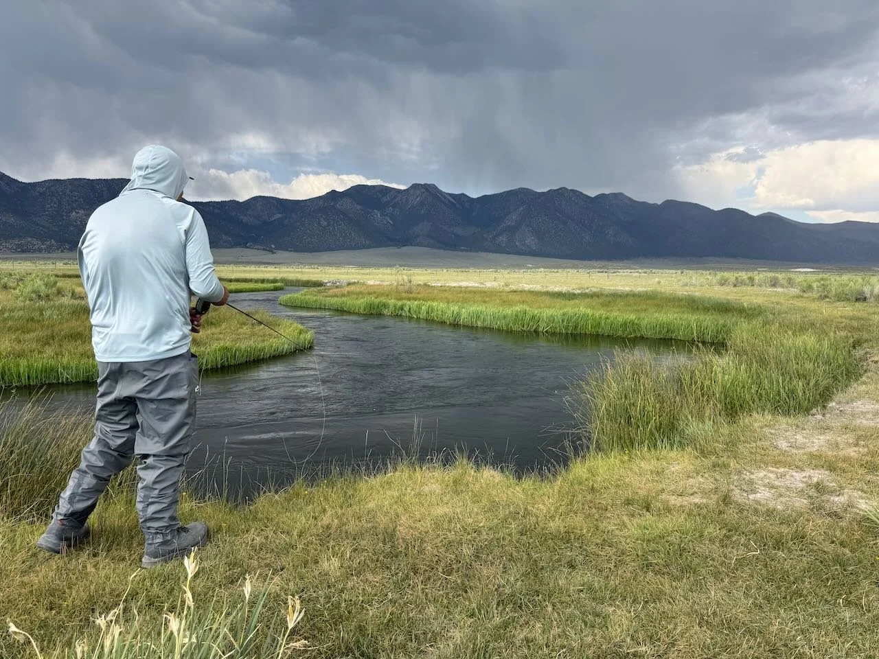 The morning hatch is from trico mayflies. Late the night before or at first light on the morning of, the male trico’s hatch. In the morning around 8:30 the female trico’s hatch and this is the hatch that fly fishers want to be on the water for. Be on the water by 8:30 rigged with a size 22 female trico dun parachute or size 22 sparkle trico dun. Cast your fly upstream of rising fish by two or three feet. A drag free drift on 6X tippet is what is needed to fool the finicky wild trout of Hot Creek. At some point in your morning fly fishing the trout will stop taking your parachute. It’s time to switch to a size 22 trico spinner pattern. The trico spinners are dead on the water and the trout know that. The trout can slurp up the dead spinners without them flying off. By late morning the hatch of trico’s is over and so it the dry fly fishing. If you want to keep fishing try using an ant, beetle or hopper pattern. It takes lots of drifts to get a fish to come to the surface for a terrestrial. Present your terrestrial patterns gently on the water as to not spook trout.