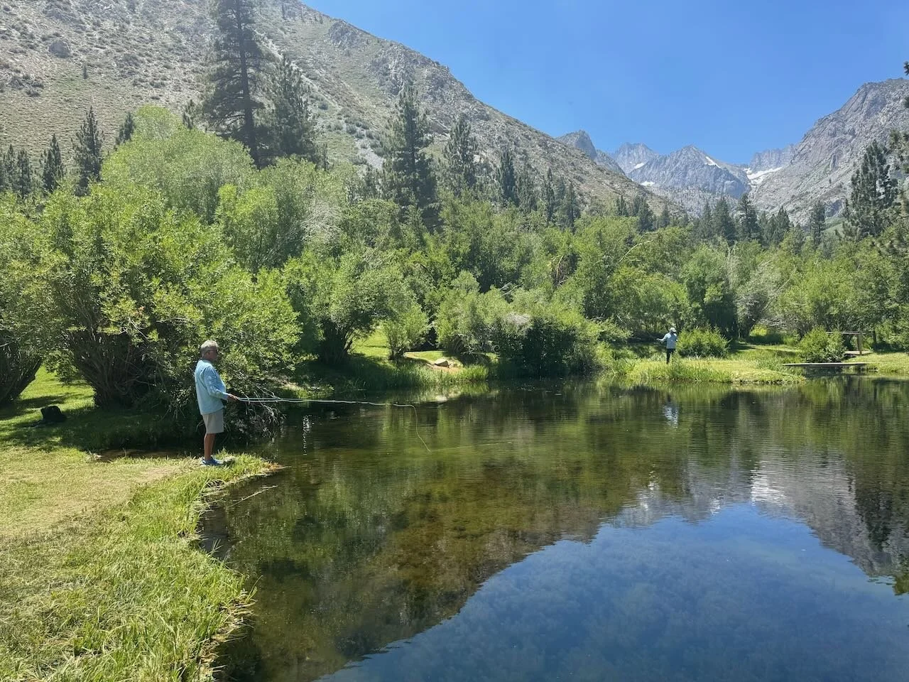 Now is the perfect time to be fly fishing in Bishop Creel Canyon. Being able to bush whack along the trails of the creek looking for those spots to cast a fly to without getting tangled is a great way to fly fish free stone creeks. Pocket water and pools are where the wild brown and brook trout are hanging out looking for a meal to float by. The stream does not produce enough calories for the trout so they are constantly looking up on the surface for a meal. This is the perfect situation to fish a dry and dropper rig. For dry flies fish your favorite dry fly as you will fish it with more confidence. For confidence dry flies try fishing with size 16 stimulators, size 16 Adams parachutes, size 16 elk hair caddis and size 16 Royal Wulff’s. For the nymphs fish with size 18 zebra and tiger midges, size 16 bead head flash back pheasant tail nymphs, size 16 bead head flash back gold ribbed hare’s ears and size 16 Prince nymphs. For the dry and dropper rig fish the nymph on a tippet of 5X fluorocarbon equal to 1.5 to 2 times the average depth of water tied to the bend of the dry fly. Four feet is the maximum length tippet to fish the dropper with as it tangles up too easy if it’s long. Fishing on Bishop Creek in the afternoon is a great way to beat the heat in the Owens Valley.