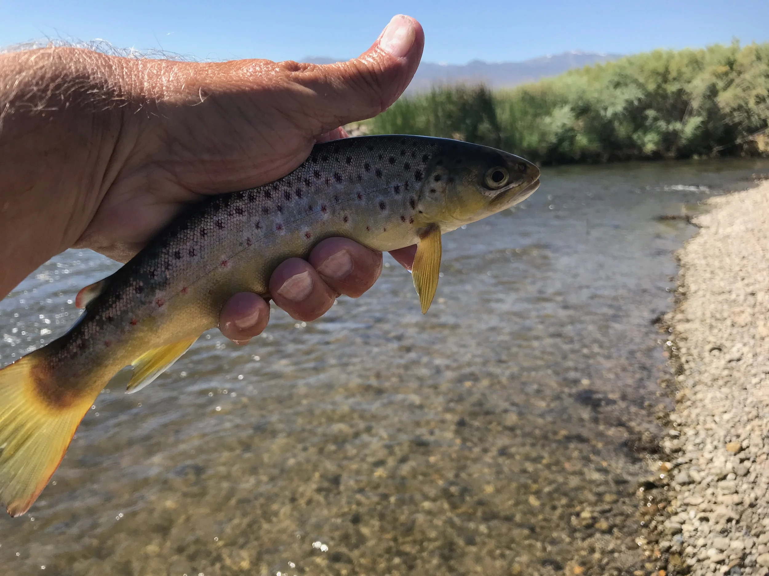 A nine inch brown trout caught at 4:30 P.M. on the lower Owens River at gate 8 on a Euro rig.