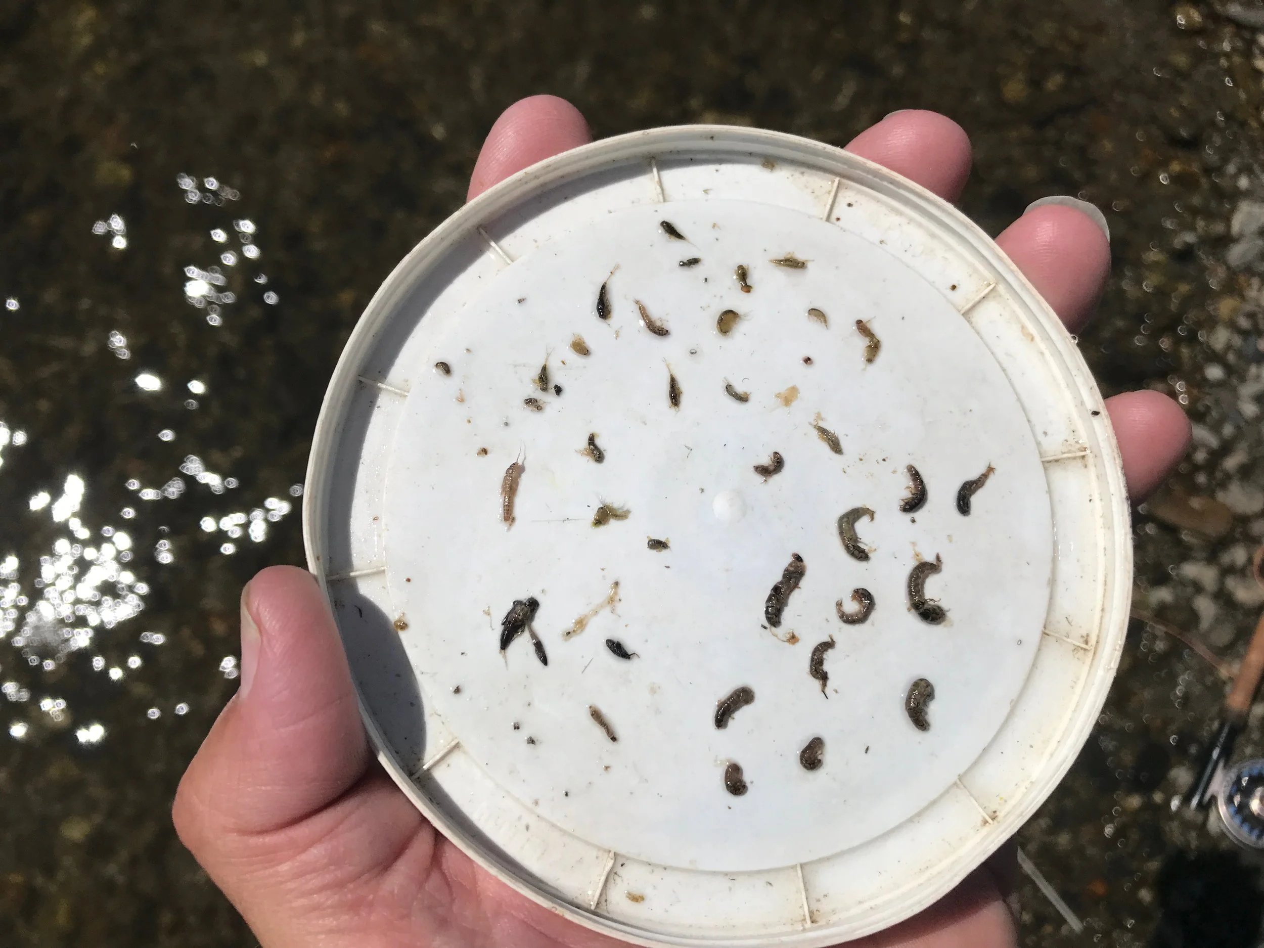 Inch worms, stick caddis, black fly larvae, a black fly, New Zealand mud snails and mayfly nymphs were found in this stomach sample. Can you identify these aquatic insects? Check out photo below for insect names.